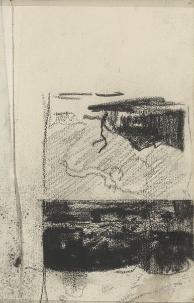 Curator: Welcome to the Rijksmuseum. We are standing before George Hendrik Breitner's "Studie, mogelijk van figuren bij een gebouw of kraam," created around 1886 to 1890. Editor: My first impression is of transience. The rough lines and incomplete forms give a sense of something quickly captured, fleeting. The medium accentuates it all. Curator: Indeed. Let’s consider those very formal aspects. The sketch appears almost cubist in its reduction of forms to near-geometric shapes. Note the bold, contrasting areas of light and shadow defining the architecture. It evokes a semiotic tension between representation and abstraction, wouldn’t you agree? Editor: It is definitely the materiality that draws me in. The humble pencil on paper emphasizes process, immediacy. Think about the act of sketching outdoors, the physical labor of rendering what Breitner observes. This isn't some high-art oil painting in a studio; it is closer to craft, a direct record of interaction with the environment. Curator: While I appreciate your focus on materiality, let us not dismiss the underlying structure. The strategic arrangement of light and shadow dictates the piece. If you look at how he used these, he essentially designed entry points and how your eyes travels from one element to another on this paper. The perspective, though gestural, still informs our understanding of space, which he managed very skillfully. Editor: It is also valuable to consider what’s not there, and not only in what we see physically rendered. The open areas, the negative space, provide balance, right? They imply movement of the body, of course, with their placement hinting at locations and positions in order of how he was perceiving reality at this moment. Think about the cost of materials too—paper and pencil are economical and easily accessible. Does that impact his subject? Curator: Certainly, the work does highlight that inherent dialectic, if only as a result of its medium, scale, and construction. Breitner seems to be less involved with creating "high art" as it were and instead captured a single, and as you so rightfully observe, transient impression. The structural framework that gives shape to this work cannot be dismissed either. It showcases the way he used contrasting form as an expression technique, and this in its core elevates it beyond being just a study. Editor: Agreed. So perhaps, rather than separate endeavors of making versus seeing, these are always intertwined considerations. Each sketch represents a single lived moment. The economic choices influence artistic direction just as his expression defined it all.