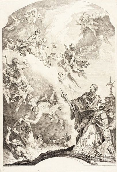 Pieter Tanjé created this print, "Flora," using etching and engraving techniques sometime in the 18th century. Look closely, and you'll notice how the etched lines create delicate tonal variations, giving depth to Flora and the cherubic figures surrounding her. Tanjé's skilled hand with the engraving tool defines the forms and textures, from the soft, billowing clouds to the delicate floral arrangements. Both etching and engraving are laborious processes that require careful planning and execution. The artist had to apply a waxy ground to a metal plate, draw the image with a needle, and then immerse the plate in acid to bite the exposed lines. Engraving is even more physically demanding, as the artist uses a burin to cut lines directly into the metal. Consider that the image is reversed when printed, so the artist must work in reverse too. This print offered a way to disseminate imagery widely and cheaply. "Flora" shows how reproductive technologies, like etching and engraving, brought classical themes into the homes of a broader public. The artistry and labor involved elevate this print beyond mere reproduction, turning it into a valuable work of art in its own right.