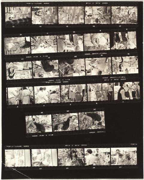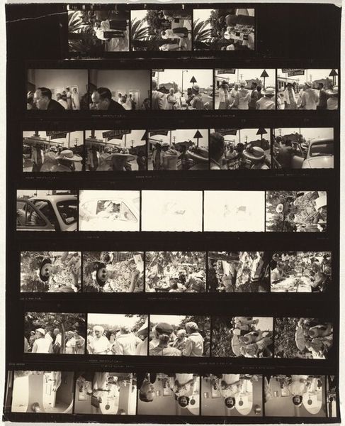 Curator: This gelatin-silver print, “Italy—Early Europe 5,” was created by Robert Frank in 1949. What's your first take on this striking example of film photography? Editor: I'm immediately drawn to the raw texture and rhythm created by the grid. The overall tonal range—those subtle shades of grey—really amplify the intimate feeling, yet somehow, the collection still maintains a fragmented aesthetic. Curator: Frank was adept at capturing emotional truth and the everyday lived experience. Here we have what seems like strips of film documenting children playing outdoors, in the street and even some wedding imagery. The children appear joyful but some scenes carry a heavy emotional resonance. What elements support that atmosphere for you? Editor: Definitely the repetition. Those rectangular frames within frames offer a sense of voyeurism and repetition with variation. The contrast between the candid play and structured composition creates tension. See how certain shapes—the children’s faces—mirror themselves in each frame. It gives you the feeling of a visual echo, linking different moments and hinting at larger cyclical patterns. Curator: Absolutely. It echoes back to a long history. Photography, since its inception, has tried to grasp the past—offering proof that something existed. Here, there are moments, individual images that encapsulate universal themes like youth and togetherness. There is a definite visual language emerging as Frank invites viewers into these lives. Editor: Right, I see that language primarily emerging from the interplay between form and subject, each tiny little photograph becoming a morpheme. Look, the scratches and dust spots act almost as punctuation marks, emphasizing the passing of time. Frank has masterfully used material constraints as part of the aesthetic narrative. Curator: In many ways, it becomes a historical text in its presentation. Frank captures this continuity that links to ancient societal symbols, rituals that continue through generations in secular forms. His framing acknowledges the continuity, the culture's resilience. Editor: This piece made me reflect on the photographer's unique role. Frank isn't simply recording a scene, but framing time in discrete doses and giving a peek into the way individual lives form within broader cultural scripts. Curator: For me, this work serves as a profound meditation on memory and experience—it gives us the everyday in fragments.