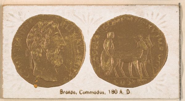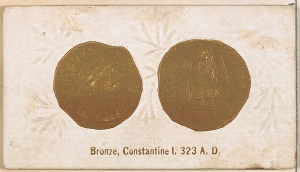 Editor: This print, “Bronze of Antonius, 138 A.D.” made in 1888 by Wm. S. Kimball & Co. showcases an aged aesthetic and it's intriguing. It's clearly referencing ancient coinage but doing so through the means of late 19th-century printmaking. What draws your attention when you examine it? Curator: The most compelling aspect is the deliberate use of period-specific methods to replicate and, therefore, circulate an image of historical significance. This raises critical questions about labor: who created the original coin die, and who produced this engraving? Also, note the 'aged paper' and 'yellowing background' – artificial effects introduced during the printmaking process, speaking volumes about 19th-century notions of antiquity and how objects accrue cultural value over time through materiality and appearance of age. Editor: That’s interesting. So, it’s not just about the image of Antonius, but also about the social implications of how this image was made and consumed? Curator: Precisely! Consider the 'Ancient Coins' series context and purpose of the item being produced in the first place, likely intended as a trade card included with tobacco products. The high art of classical portraiture meets mass production and popular consumption. Does this democratize art, or cheapen the representation of history for commercial gains? Editor: It makes me think about how much the choices about material and technique shape our understanding and interaction with historical imagery. Curator: Right, examining the engraving process unveils a network of labor, consumerism, and even a certain degree of cultural appropriation. These “ancient coins” in mass produced form tell as much, or even more, about their time of manufacture and distribution than the emperor. Editor: I see what you mean. It’s more than just a portrait, it's a reflection on production and its relationship to art. Curator: Yes! The tension and the dialogue between different materialities are very important and give us a great starting point for more research and observation.