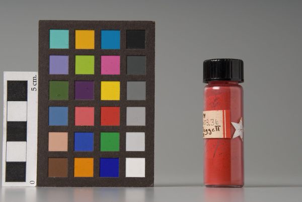 Curator: Here, we see "Mapico Red," synthetic iron oxide pigment from Binney & Smith. Editor: It looks like a tiny universe of rust, bottled up and labelled. There’s something so elemental about that shade of red. Curator: Indeed, iron oxides have a long history in art. Their stability and lightfastness makes them reliable and essential. Editor: It also feels like the beginning of things, you know? That raw potential before it's transformed into something else. Curator: Its texture, those minuscule particles, reflect a deep engagement with materiality. The color chart, a helpful artifact. Editor: I find myself considering, where might this potent color end up? Whose canvas will it set ablaze, what story will it help tell? Curator: Quite right. This little jar contains a whole world of creative possibility. Editor: A lovely thought to leave us with. Thanks!
