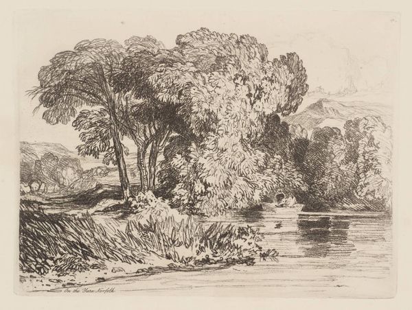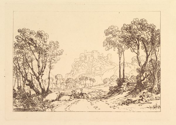 Editor: This is "A Study" by John Sell Cotman. It's an undated print from the Tate Collections. There's something so peaceful about this landscape. What can you tell me about it? Curator: Landscape motifs often symbolize a search for Arcadia. Notice how the trees frame the distant city? What does that juxtaposition suggest about humanity's relationship with nature, and the encroachment of civilization upon it? Editor: It makes me wonder if the artist is trying to say something about progress. Curator: Precisely! The figures walking, the architecture… They all become symbols of change, viewed through the lens of the natural world's enduring presence. Perhaps Cotman is reflecting on what is lost, and what remains. Editor: That gives me a lot to think about, especially about the symbolism of nature itself. Curator: Indeed. Every element contributes to a larger narrative, echoing cultural anxieties and aspirations through visual form.