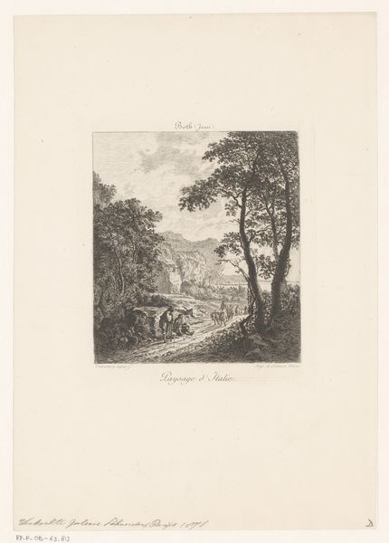 Editor: This is "Gezicht op de rivier Divie," or "View on the River Divie," an engraving by James Fittler, from around 1801-1802. It’s such a peaceful scene, a group of cows wade in the water and everything is so meticulously detailed. What do you see in this piece? Curator: Beyond the picturesque depiction of the River Divie, I see a representation of Romantic-era notions of nature and its relationship to societal structures. Consider how the idealized landscape, untouched, seemingly exists separately from the burgeoning industrial world. Who benefits from this constructed idyllic image, and whose labor is erased? Editor: That's interesting, I hadn’t thought about it like that. The focus seemed to be on the beauty of nature. So, who *is* this for then? Curator: This is a view that largely caters to the privileged. The image idealizes a rural scene divorced from the realities of the labor that would sustain it, appealing to an elite class who could afford to consume this version of reality through art. Do you notice how even the figures within the landscape are positioned more as observers or embellishments? Editor: Yes, now that you mention it, they're quite small in comparison to the vastness of the nature surrounding them. I see the farmers with cattle in the distance but only vaguely. Curator: Exactly! The artist creates this deliberate distancing. Furthermore, thinking about the time, consider the implications of representing a landscape as untouched at a moment when ideas about enclosure, property, and control over natural resources were becoming ever more urgent. Whose land is this? And who gets to define its beauty? Editor: I guess, focusing on just the visual beauty skips over important questions about land, labour, and who controls those narratives. It gives us this comfortable, pretty image but leaves out the bigger picture. Curator: Precisely. Analyzing art through an intersectional lens reveals not only artistic skill but also how power dynamics subtly shape even the seemingly innocent portrayals of the world around us. Editor: That makes me think a lot differently about landscapes now! Thanks, that's definitely given me something to reflect on.
