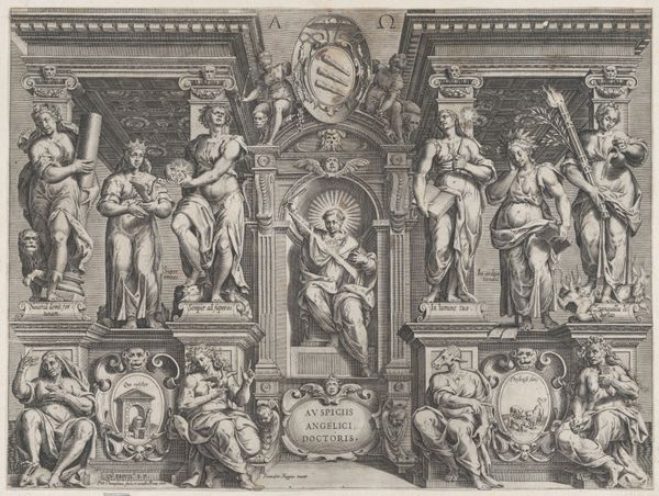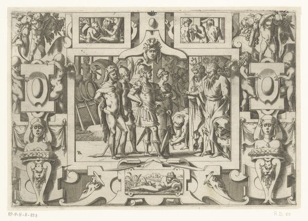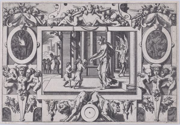 This engraving, "Queen Ino and the Husbandman," was created by René Boyvin around the mid-16th century. The composition is immediately striking for its intricate framing, which surrounds a central narrative scene. Note the tension between the classical figures and the elaborate ornamentation, setting up a dialogue between form and content. The stark contrast of light and shadow, achieved through fine lines, adds depth and drama. Boyvin layers the visual elements of classical mythology, creating a complex interplay between the main scene and its decorative borders. The husbandman, a symbol of toil, contrasts with the excesses represented in the frame. This contrast invites us to consider how the print challenges fixed meanings and values. Boyvin's piece functions not merely as an illustration but as a cultural artifact. Its lasting appeal lies in the artist's ability to create a dynamic interaction between aesthetic form and broader intellectual themes.