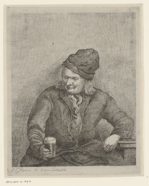 Curator: John Greenwood's engraving, "Man met een roemer," likely created between 1739 and 1792, offers a compelling glimpse into 18th-century life and genre-painting traditions. Editor: It has this very mellow mood. All soft, cloudy grays. I feel like I could practically smell pipe tobacco and stale ale looking at this... sort of makes me want to lean back with a drink of my own! Curator: Observe how the medium, engraving, inherently involves a transfer of labor, from artist to the craftsman preparing the plates and then the printing process itself, emphasizing production rather than unique creation, challenging romanticized notions. Editor: Absolutely. But looking closer, you can also sense the character and texture given by those intentional lines. It makes the whole process so palpable. Almost like watching a memory unfold through a haze, do you get what I mean? Curator: Furthermore, consider that drinking vessels and tobacco were integral aspects of social life and commercial trade during this era. Examining these materials within art provides tangible links between cultural expression, commerce and consumerism. Editor: Agreed! The roemer's reflection...almost mirrors this bloke's jovial state of mind, don’t you think? There is a distinct baroque charm that draws your gaze right into the heart of daily indulgences! Almost humorous, really. Curator: Greenwood's technique reveals insights into both material culture of the period and socio-economic considerations of art production... from creation to reception, engaging many hands, markets, and materials. Editor: Looking into Greenwood's engraving gave a fascinating peek through time - from his creation all those years ago to what we see today!