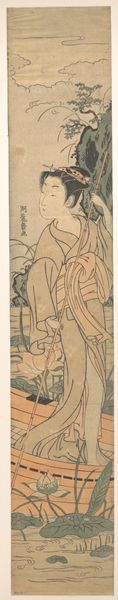 Curator: Allow me to introduce “Young Lady and Iris Garden,” an Ukiyo-e print by Chōbunsai Eishi, dating sometime between 1756 and 1829. It's now held at the Metropolitan Museum of Art. Editor: It feels… fragile. The color palette is restrained, and the figure seems almost to blend into the background, like a fleeting memory. Curator: The subject is placed within the context of iris— a material associated with feminine virtue in Edo-period Japan and featured extensively in clothing patterns for women. It evokes purity and represents traditional craftsmanship and design from that era. Editor: The iris carries further significance. Historically, in Japan, it symbolizes protection, particularly for boys. Seeing it here associated with a young woman... does it hint at hopes for her safety, perhaps even a longing for strength in a society with defined gender roles? Curator: Ukiyo-e prints were often products of a collaborative process. One artisan would create the original design, another would carve the woodblocks, and another would actually print the image. Consider the accessibility this offered: multiple copies, more affordability, leading to wider distribution and consumption. Editor: It's also striking how she's depicted, eyes downcast, seemingly absorbed by something beyond our view. The Iris might guide the viewer's eye from top to bottom and invite reflections on the inner life during an era of shifting social mores. Curator: Absolutely. The line work itself bears examination. There's a delicacy in the way her robes fall, rendered with precision, yet implying a certain lightness and grace that speaks to the level of artisanship in block carving and print-making that circulated consumer items widely throughout Edo society. Editor: It's a reminder that even in what we might consider "high art," symbols often carry coded social meanings, speaking volumes about cultural values, beliefs and hopes within society. Curator: Thinking about the labor involved, and the materials selected, offers tangible entry points. It reframes what "art" meant during this era. Editor: Ultimately, this artwork feels like a quiet meditation—a window into both personal sentiment and the collective imagination during Eishi’s time.