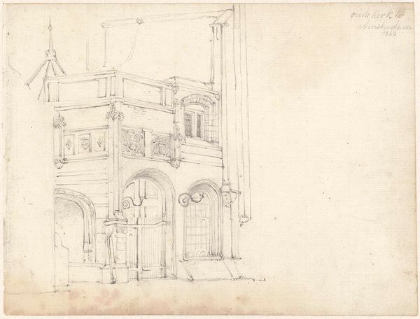 Editor: So this drawing, "View of a Courtyard in Loschwitz (?)", was created sometime between 1800 and 1822 by August Heinrich. It’s a pencil drawing of a pretty typical-looking European courtyard. The more I look at it, the more melancholy it seems... what do you see in this piece? Curator: Oh, melancholy is a perfect way to describe it! It’s like a half-remembered dream, isn't it? The way the pencil lines almost… tremble? Gives it that feel. Heinrich is inviting us into a space that feels very private, almost voyeuristic, like we’re peeking into a moment frozen in time. And there is a slight feeling of foreboding. I wonder what's behind that wall? What do you think, given it's Romantic era? Editor: You’re right! Knowing it's from the Romantic period definitely shifts my perspective. I mean, the Romantics were all about feeling and the sublime. Maybe this courtyard represents an inner emotional state, all quiet longing and hints of something hidden? Curator: Exactly! Think about the cityscape theme - those arches could represent possibilities and journeys that never materialized! That fragile tree, reaching awkwardly upwards… is it resilience, or a quiet struggle? Editor: I never considered the tree that way. The composition creates this very enclosed feeling. Is the intention perhaps to make viewers contemplate what is to come. Maybe the drawing is of somewhere abandoned? Curator: Precisely! We’ve gone from simple architectural rendering to a portrait of a soul, wouldn’t you say? Editor: Absolutely. I went from seeing a basic sketch to understanding it's a quiet exploration of human emotion through the lens of architectural space! Thanks! Curator: My pleasure! Sometimes, the most seemingly straightforward images whisper the loudest secrets.