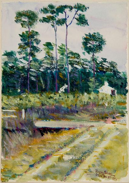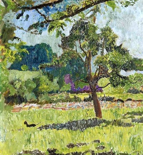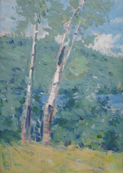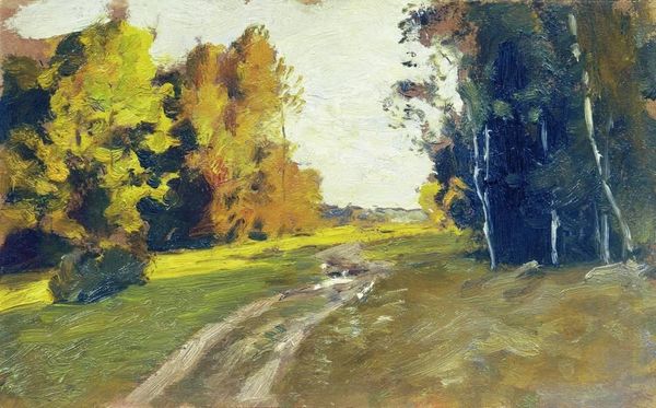 Arkady Rylov painted this scene of a 'Stormy Day' using oil on canvas. Immediately striking is the dominant green hue, which saturates the landscape and gives the piece a vibrant energy. The composition is divided between the foreground of a grassy path, framed by lush trees to the left, and a bright sky filled with dynamic cloud formations. Rylov uses visible brushstrokes to create texture and depth, particularly in the foliage, suggesting a sense of movement and life. The pathway draws the viewer's eye into the distance, creating a play between near and far. Rylov's art can be interpreted as a semiotic system where the elements like the path and trees are signs. His interpretation and presentation of nature destabilizes traditional landscape painting by bringing a dynamic, emotionally charged viewpoint. Each element reflects a deliberate visual and cultural code, inviting ongoing discussion and interpretation.