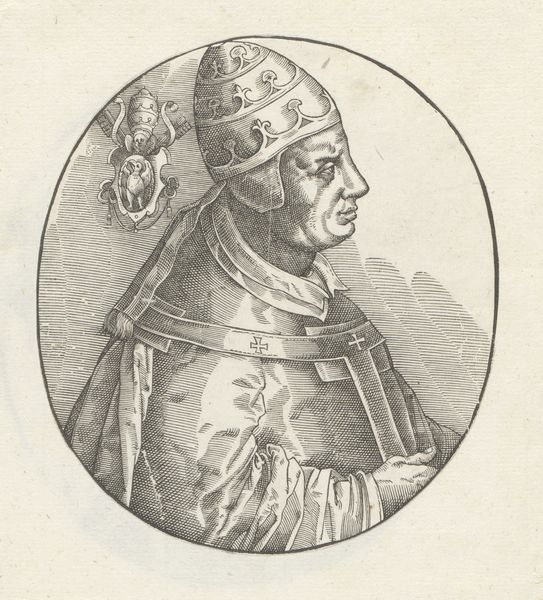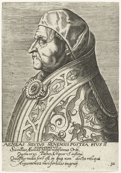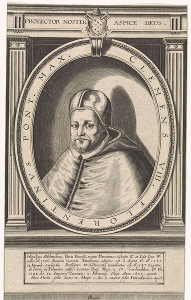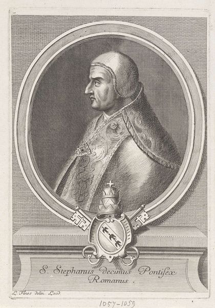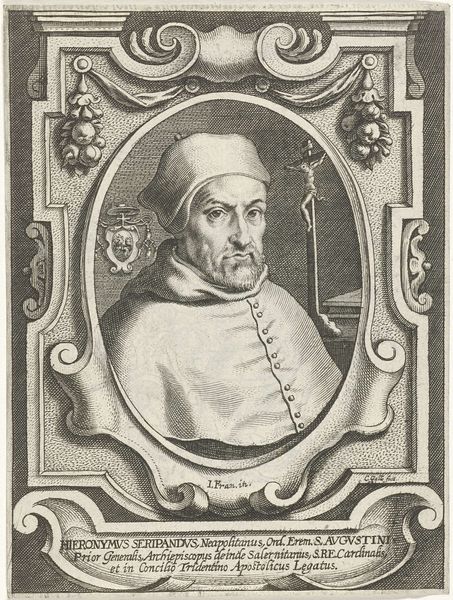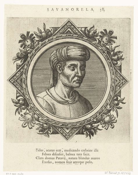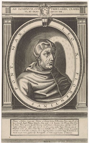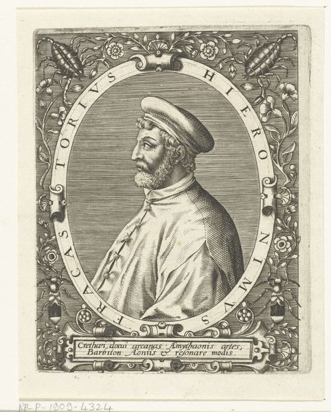 Curator: Welcome! Today, we'll be looking at "Micha", an engraving created around 1613 by Cornelis Galle I, currently housed at the Rijksmuseum. Editor: My initial impression? Intriguing. The level of detail achieved through engraving is remarkable, and there's a palpable sense of gravitas, a certain weighty formality in the subject's gaze. Curator: The figure presented is most likely the prophet Micaiah or a figure associated to the period. Look closely, and you will observe phrases like "plango, et vt Ifrael maestus mecu, rogo, plangat", a lament to Israel; or, "Christi ortum, et magni ufsa reuelo Dei", heralding the revealing of a savior and God's secrets. Editor: Semiotically, that frame almost operates like a picture-within-a-picture, emphasizing the contained and constructed nature of the image. I notice also that the heavy line work builds a strong sense of depth. Consider the way light and shadow define the contours of his face and the folds of his garments. Curator: The visual language certainly recalls mannerism, evident in the expressive, somewhat exaggerated features, serving to emotionally move and unsettle the viewer. Editor: Exactly! I'd agree that these are certainly traits found within that style. Think about the subject's attire: What do those garments signify? Are they intended to denote religious authority or something else? And is that deliberate artifice or commentary? Curator: Well, his clothing would signal his high social standing, perhaps a clergyman, given that he's shown in profile reading, possibly from sacred scriptures, further associating the character to clerical roles or religious learnedness. This reinforces the theme of divine revelation through written authority. Editor: That makes sense within the historical and cultural milieu. Looking closely, the book’s presentation within the oval has sharp and triangular features; by contrast, the human subject features more round curves to differentiate nature vs spiritual elements. Curator: I hadn't considered the curves. Interesting. Seeing the symbolism inherent in form emphasizes that cultural continuity we have previously talked about in these works. Editor: What a compelling piece! Seeing these formal decisions creates, if anything, an artwork for historical thinking. Curator: And a reminder of the rich symbolic vocabulary that art from this era employed, even in a portrait format.