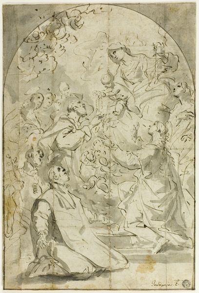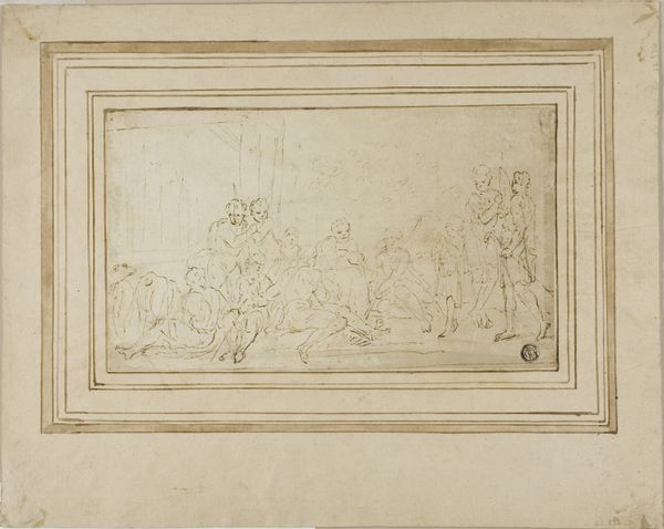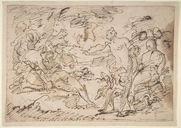 Nicolas Pierre Loir created this drawing of nymphs and satyr with pen and brown ink. At first glance, the composition feels like a dance between clarity and ambiguity. Loir uses delicate lines to define forms, yet the lack of shading creates a flattened space. Notice how the satyr on the left holds the panpipes, seemingly frozen mid-gesture. His muscular form is juxtaposed against the reclining nymphs, whose bodies flow into one another. This tension between activity and repose animates the scene. The composition is structured around a series of horizontal layers. The figures are arranged across a shallow foreground, with a hint of landscape in the background. The linear quality of the drawing emphasizes the surface, reminding us of the artwork's constructed nature. This calculated arrangement invites us to question the relationship between these figures. The drawing is not just a representation of a mythological scene; it’s an exploration of form, line, and the very act of seeing. The drawing offers multiple perspectives and interpretations, resisting any single, fixed meaning.