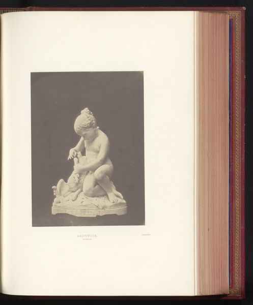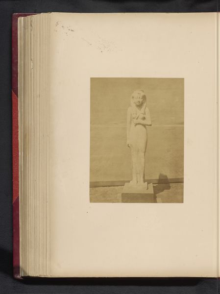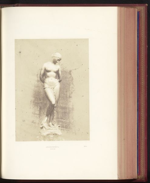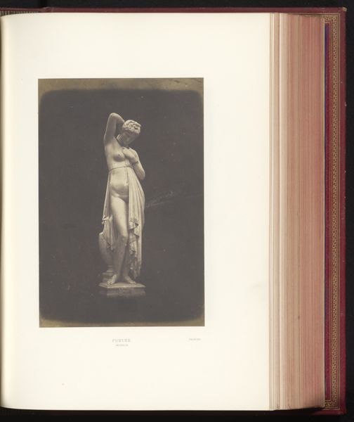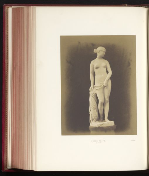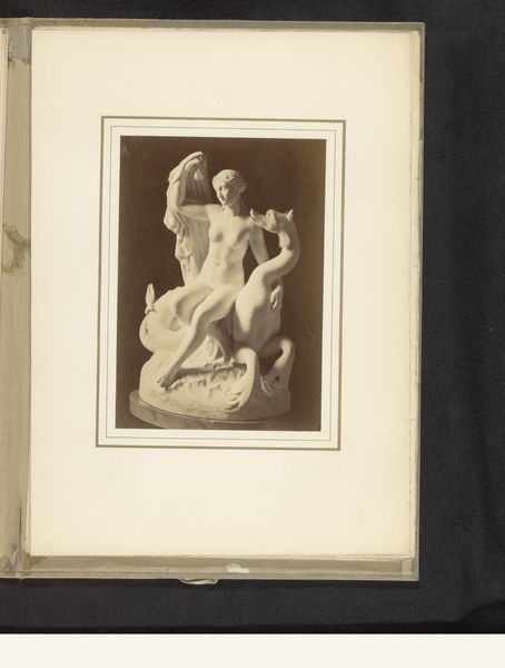 Editor: Here we have a gelatin-silver print of a sculpture, taken before 1859, titled "Sculptuur van Eva door Leopold Borbone", or "Sculpture of Eve by Leopold Borbone." The photograph's muted tones give the statue a sort of ghostly, antique beauty. How do you interpret this work? Curator: Well, first, let's acknowledge the inherent layering of representation. We aren't viewing the sculpture directly, but a photograph *of* a sculpture. Consider the original context: the mid-19th century, photography emerging as a new medium, grappling with how to depict and, perhaps, legitimize itself alongside more established art forms. Then consider the statue of Eve. How does the photographic rendering impact the classical nude? Does it amplify or soften the sculpture's original intent? Editor: That's a good point; photography almost flattens the sculpture, losing some of its three-dimensionality, while the tones bring out new details. Curator: Precisely. And we can think about the loaded symbol of Eve herself. Here she is, caught in a moment of original sin. Photography's inherent indexicality adds a layer here – does the photograph 'prove' Eve's existence, even within the fiction of art? Editor: I hadn't thought of the photograph itself becoming part of the narrative. Curator: It’s a reflection of societal power, too. Consider who had access to photography at this time, and how that access shaped the images they chose to create and share. Was this image intended to titillate? To educate? To elevate photography itself? These are critical questions. Editor: Seeing it through that lens makes me question the role of the photographer in perpetuating, or even subverting, those power dynamics. Thank you! Curator: It’s a fascinating intersection of art, technology, and cultural ideology. This image isn’t simply a picture; it's a statement about how we construct narratives and understand ourselves through visual representation.