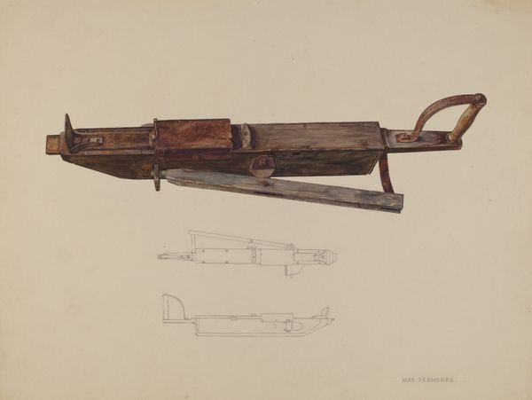 Curator: Carl Buergerniss’s "Sabre", a 1942 watercolor drawing. The artist, as the title suggests, directs our eye to the stark simplicity of weaponry rendered in this delicate medium. Editor: It feels so studied, doesn’t it? Like a meticulous examination, almost forensic, rather than celebratory. Melancholy almost... or is that the wartime context creeping in? Curator: Undoubtedly, the artwork functions on several levels. The acute realism combined with watercolor presents an intriguing duality. Notice how Buergerniss captures the heft and menace of the sabre, yet the medium softens, almost dematerializes, its lethal intent. Editor: True! The way the light catches on the guard...it's quite beautiful. A stark, undeniable, beauty. Almost an admiration despite its very reason for existing. I imagine him studying every detail, losing himself in the intricacies... a welcome escape, maybe. Curator: A plausible theory! The drawing offers, primarily, a study in form. The two views—the full sabre and a detailed study of the hilt—provide an understanding of structure and design, revealing elegant functionality. Consider how Buergerniss uses subtle gradations of tone and shading to define the contours and the play of light on the metal surfaces. Editor: Yes, technically dazzling. Yet beyond this undeniable craftsmanship, the piece speaks of something else…the sheer absurdity of transforming a killing instrument into an object of such beauty. Doesn’t it just give you pause? It reminds you how every single little component had been refined for only one end... Curator: I understand the impression. Perhaps this aestheticisation is, ironically, what renders the horror all the more palatable. The meticulous rendition removes it, elevates it and even somewhat normalizes its significance within society. Editor: Absolutely. Now, looking at it, one may miss some of its historic significance. I have this image of Buergerniss wrestling with these conflicted emotions... Curator: Ultimately, Buergerniss provides us a stark meditation, expertly presented, on design, purpose, and perhaps even a glimpse of the troubled zeitgeist from which it emerged. Editor: Indeed, a memento mori rendered with unsettling grace and almost compulsive beauty. Definitely leaves a mark, pun intended.
