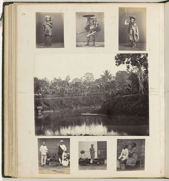 Editor: This fascinating gelatin-silver print, titled "Dierentuin en portretten" by Woodbury & Page, was created sometime between 1864 and 1866. It's like a collection of photographic studies pasted onto a single page: portraits interspersed with a landscape view. What strikes me is the contrast between the posed studio shots and the more open, natural scene. What do you see in this work? Curator: The pasting suggests a system and highlights the photograph as an object—a commodity, even. Notice the material processes. Each albumen print meticulously produced and then arranged within the confines of an album page. Think about the labor involved: the photographers, the printers, and those who sourced the materials, even the people in the photographs who produced local craftworks. Editor: That's a great point! I hadn't really considered the production chain. How does the social context play into that? Curator: Well, Woodbury & Page operated in the Dutch East Indies during a period of intense colonial activity. The photographs document the local population, their dress, their environment. Consider them not as neutral representations but as artifacts of a power dynamic, where photography becomes a tool for cataloging and understanding--perhaps even controlling--a foreign culture for a European audience. The arrangement itself, these varied pictures pasted side by side, encourages a consumption of culture. Editor: So, even in its composition, the piece is about framing and selling an idea of a place. I never would have thought of the colonial implications so directly, seeing just portraits. Curator: Exactly! By examining the material means of production and how they were employed within a specific social context, we get closer to a fuller understanding of the work’s complex historical and cultural significance. What have you learned, viewing the image from this perspective? Editor: That it is more important to look beyond the pure representation and consider the materiality and means of production. Thank you!