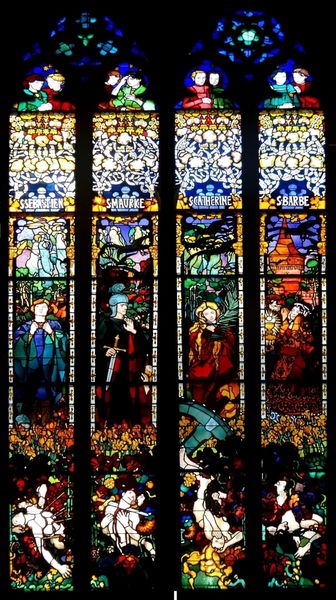 Editor: So, this gorgeous stained-glass artwork is "St. George, Michael, Anne, and Mary Magdalene" by J\u00f3zef Mehoffer, created around 1910. The color palette strikes me first – so jewel-toned! It feels both reverent and fantastical at the same time. What strikes you when you look at this, in the historical context of its creation and display? Curator: Well, its placement within Fribourg Cathedral whispers volumes. Imagine light streaming through it! I’m really captivated by the anachronistic collision here. We have Medieval subject matter – saints, dragons – rendered with the swirling lines and flattened perspective we often associate with Art Nouveau. It’s as if Mehoffer were summoning the past while simultaneously catapulting it into the present, early 20th century. It almost looks medieval without trying too hard, the opposite of revivalist movements; isn’t that interesting? Editor: It *is*! So it’s less about recreating the past and more about… channeling it? Like a medium? Curator: Precisely! Look at the faces of the saints. Are they not infused with a peculiar sense of dreaminess? Mehoffer invites us not to passively observe a religious narrative, but to dive deep into our own symbolic interpretations of these timeless tales of faith and bravery. Is it working on you in any way, any particular figures, features? Editor: Definitely Mary Magdalene and her roses in the stained glass. It seems… unusually human for stained glass; if that makes any sense. Curator: Human indeed! And that's the genius of it. It’s more than just storytelling. It's about opening a dialogue, across centuries, using symbolism as our common tongue. Editor: Wow. I came in expecting some historical context, but I am leaving thinking about stained glass in a whole new, more creative and engaging, way!