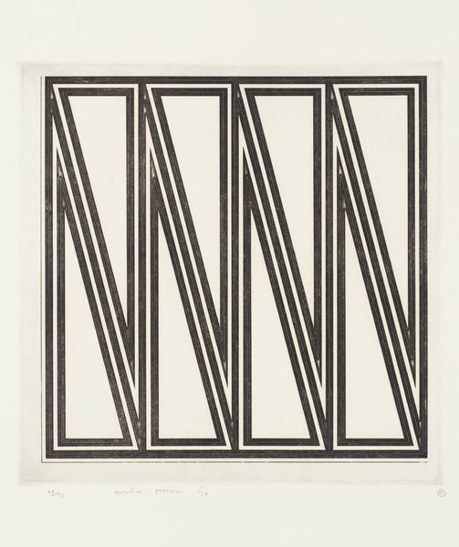 Curator: This print, "D. Drop Initials," is by Gordon House. Look at the way the artist uses such simple materials to create something so visually striking. Editor: Initially, I'm seeing paired gates or perhaps even a simplified rendering of organ pipes. There is a sense of entry or transition implied, wouldn't you agree? Curator: The process here is fascinating. House, known for his engagement with printmaking, explores the relationship between mechanical reproduction and the artist's hand. Editor: These geometric forms evoke ancient symbols. The step-like patterns remind me of pyramids or ziggurats, structures associated with power and spiritual ascent. Curator: I think it is the use of simple lines and their relation to industrial processes that gives this work its enduring quality. Editor: The stark contrast between black and white creates a powerful visual dichotomy—light and dark, positive and negative space. Curator: Precisely! House turns what could be seen as mundane into a thought-provoking visual experience. Editor: It's interesting how these elemental forms trigger deep, almost primal associations.