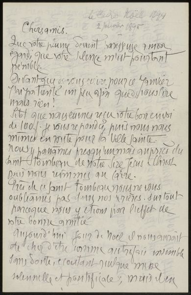 Curator: We're looking at “Brief aan Andries Bonger,” a letter composed before 1895 by Émile Bernard. This delicate drawing incorporates ink on paper, preserving a piece of art history through photography. It's fascinating to witness the raw interaction between an artist and his materials in a pre-digital age. Editor: Yes, and even beyond that – look at this writing. It almost appears as an abstraction, a coded world to get lost in. So intense and personal. It reads like a diary entry. You sense intimacy, loneliness, artistic struggles, right? Curator: Absolutely, the handwritten nature emphasizes a certain type of physical production. Before mass printing, written communication possessed a distinct material value. Each word meticulously rendered by hand creates layers of social meaning about labor, literacy, and class that shaped the relationship between writer and receiver. Editor: I completely see what you’re saying but the personal is just jumping out here, you know? You feel the pressure on this person; the urgency and hope behind their artistic mission...It feels as if he's directly communicating a state of being to us, not just a dry report. Curator: Perhaps, but think about the paper itself. Where was it made? By whom? Who would be able to access something like that? Paper in the pre-digital world involved entire social, economic, and industrial systems that enabled people to send and record history, including letters like this. We can't abstract this. Editor: Fine! I won’t then! It's amazing to realize all that human labor comes down to the final product. The act of transferring a deeply personal thought onto material reality has been captured. Curator: Agreed. Seeing the evidence of craft underscores not only our role as interpreters of intent, but also as material witnesses. It shifts our gaze beyond just aesthetics toward acknowledging labor, tools, and production in culture-making processes that remain obscured from mainstream interpretations of art history today. Editor: So, while our connection starts at emotional immediacy, now we see this sketch carries with it the story of a particular time. An economy behind simple sharing, like here, in an old correspondence, or even a humble notebook... Amazing.