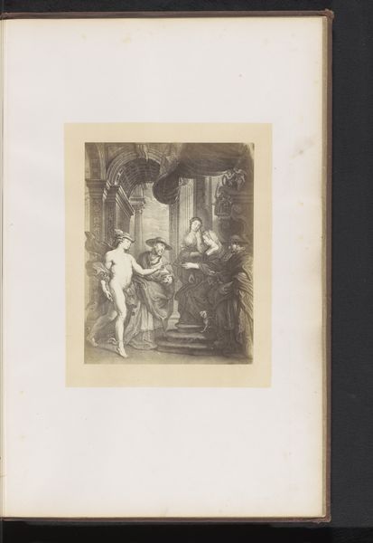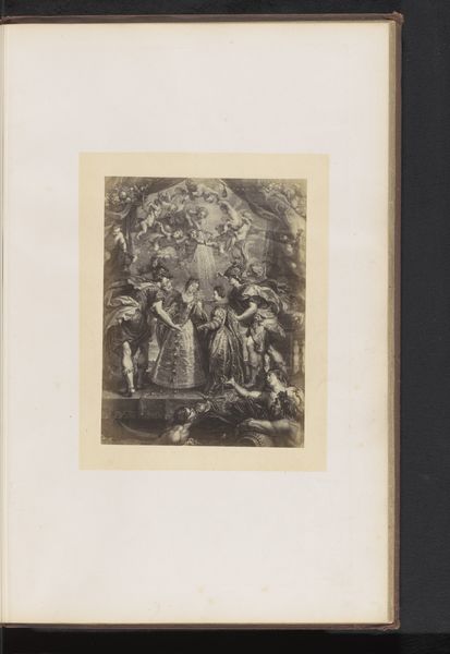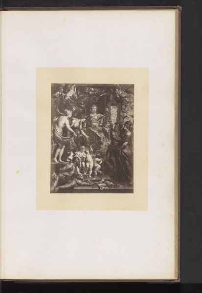 This is a photographic reproduction of an engraving of The Marriage of Maria de' Medici to King Henry IV. The original painting was made by Peter Paul Rubens. Rubens’ cycle of paintings of Maria de Medici, commissioned for the Luxembourg Palace in Paris, portrays the life of the French Queen as a sequence of triumphant historical and allegorical scenes. This one shows her marriage to Henry, with the figure of Henry being represented by a portrait held by an allegorical figure. This way, the painting is able to overcome the fact that Henry himself was not actually present at the wedding. The painting, and this print after it, speaks to the way images of the monarchy were carefully crafted and disseminated. To understand the political role of the image in this time, we can consult letters, memoirs, and diplomatic records, as well as the critical writings of the period. These sources allow the art historian to understand the role and function of art in its original context.