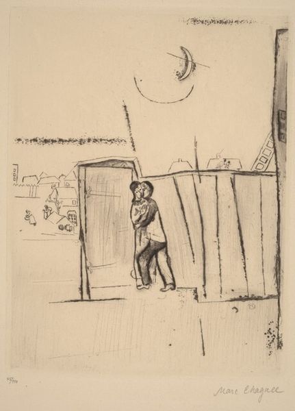 Marc Chagall made this print, The Greeting, with etching, and the absence of color is striking. I find myself thinking about the marks he made to create this world. The heavy lines next to the sketchy ones give everything such a strong presence. Like, look at that dark, solid rectangle floating above the two figures. It feels like it’s there to balance the scene. But everything is also kind of falling apart. Those stairs leading nowhere. Is that really a church? Chagall has such a sense of humor, like Philip Guston, maybe. They share this way of poking fun at the world but also filling it with such heavy emotion. This print isn’t just about seeing, it’s about feeling the space between things, the untold stories, the wobbly beauty of it all.