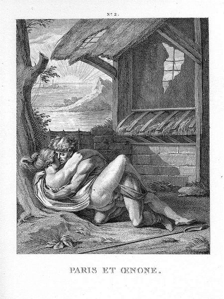 Editor: So this engraving, titled "Mars and Venus" by Agostino Carracci, presents a really intimate scene. It’s quite striking how the artist uses the stark contrast of black and white to define the forms. What do you make of the overall composition? Curator: Formally, I find Carracci’s control over line and value exceptionally compelling. Note how the engraver manipulates the density of lines to achieve depth and volume. Observe how the dramatic diagonals—formed by the bed's curtains—draw the eye towards the central figures. Editor: I see what you mean! The composition really forces you to look at Mars and Venus embracing. Do you think there is any kind of hierarchy in the image? Curator: Certainly. There’s a clear foreground, middle ground, and background. Notice the placement of armor in the lower left corner. While technically in the foreground, its receding scale positions it as recessive in importance. Editor: That makes sense. The armour almost feels like an afterthought. What about the textures? There is a stark distinction between that and the texture of the bed linen. Curator: Indeed. Consider Carracci’s masterful rendering of texture. The contrast between the smooth skin of the figures and the textured fabric is striking. Note also the interplay between the rounded forms of the figures and the rectilinear structure of the bed. These contrasting elements are key to the picture's design. Editor: This image now appears to me as carefully constructed, emphasizing a certain set of structural and formal attributes of the image rather than some narrative interpretation. Curator: Precisely. And considering this print through formalism also provides an opening into examining the broader aesthetic priorities operating within Carracci’s practice.