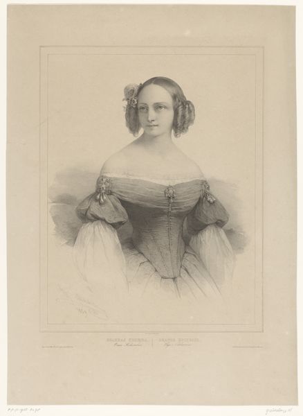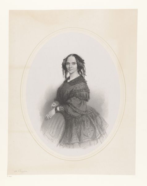 This is Ludwig Theodor Zöllner's portrait of Auguste Henriette Wilhelmine Werner, made using an engraving technique. The composition is immediately striking for its balance. The figure is centrally located, creating a sense of stability. Zöllner uses line and form to define Werner's features. Note the contrast between the dark, solid masses of her dress and the delicate, lace details at her collar. The shawl draped across her arm introduces a soft curve that softens the rigid structure. Consider the semiotic implications of this portrait. The symmetry and clear depiction could be interpreted as signs of order and rationality. However, the subtle textures achieved through engraving, destabilize this sense of perfect representation. The portrait engages in a discourse about how we perceive and interpret the world. It shows us how formal structure can be both a tool for representation and a site of deconstruction.