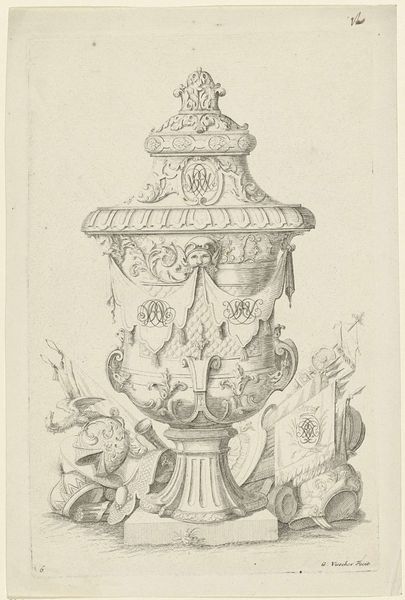 This engraving shows a design for a five-armed candelabra by Gabriel Huquier, dating back to the 18th century. The elaborate design, intended for royalty, reflects the opulence of the era, a period marked by the concentration of wealth and power. Note how the candelabra is adorned with an eagle and a cherubic figure, motifs that were often used to convey messages of power, divinity, and authority. The eagle in particular, a symbol of the Roman Empire, and later adopted by other European monarchies, suggests a desire to align the monarchy with the grandeur and perceived legitimacy of past empires. Consider the context of the Enlightenment, where the concept of divine right was being questioned, even as the monarchy sought to reinforce its image through displays of power. While the piece speaks to the aspirations of the monarchy, it also provides us with insight into the socio-political tensions that were simmering beneath the surface of 18th-century Europe.