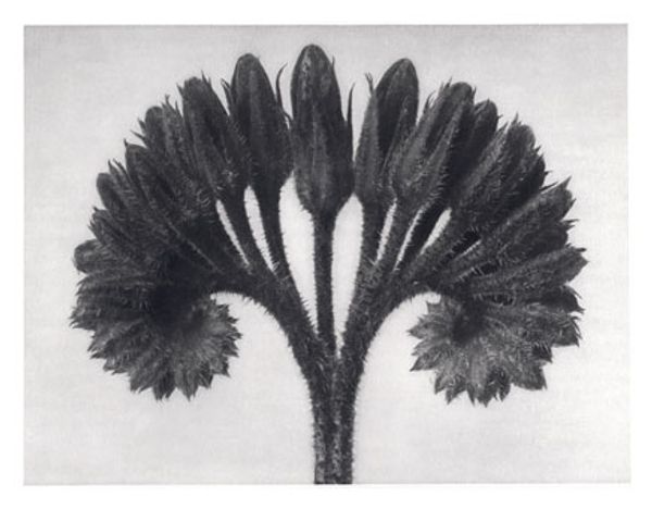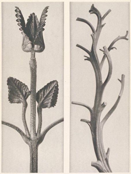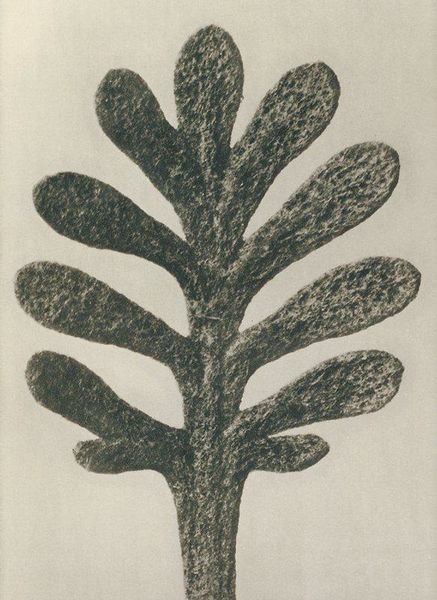 Curator: What strikes you first about this image? It's "Plantstudie" by Karl Blossfeldt, created in 1928. It’s a gelatin-silver print currently residing here at the Rijksmuseum. Editor: The texture! It’s so tactile, almost medieval, like a gothic ironwork design found in a cathedral. The stark contrast elevates the leaf to something almost architectural, yet intensely organic. It feels both powerful and fragile, a monument in miniature. Curator: Blossfeldt really had a knack for finding the underlying structures within nature, didn't he? He blew up these botanical details to reveal the hidden artistic forms. He used photography as a tool for teaching, to make people really *see* the artistry of the natural world. Editor: Absolutely. And in magnifying this single leaf, he strips it of context. It ceases to be just a part of a plant and becomes this incredible object, charged with symbolic weight. Leaves often represent cycles, renewal, and the transience of life. Seeing it isolated like this heightens that feeling of ephemerality, even vulnerability. Curator: It’s like he’s offering us a new visual vocabulary. Looking at it now, almost a century later, you see echoes in art deco designs, machine-age aesthetics… It's surprising how timeless this study remains, how thoroughly modern despite its botanical subject matter. Editor: Time plays strange tricks with symbols. When I observe something reduced down to basic, minimalist outlines, it recalls an archaic stamp from an unremembered land; here we observe all forms distilled into their skeletal shapes where meaning takes on a very elemental quality. We read not only nature here but our own projected stories. Curator: Well, it definitely gives you food for thought about the relationships between nature, art, and design! It really pushes you to see nature not just as pretty but to also understand nature as inspiration, an idea, and design itself. Editor: Yes! This seemingly simple plant study feels rich with implication. Like looking at an artifact from an alien planet that nevertheless speaks directly to our deepest archetypes of growth and decay. Intriguing, wouldn't you say?