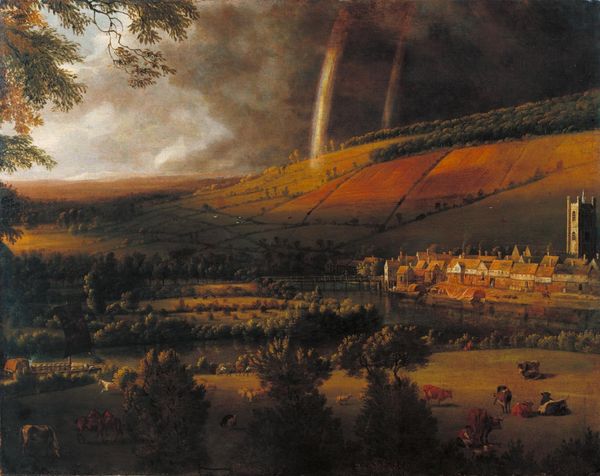 Curator: Look at "The Rainbow Landscape" painted around 1636 by Peter Paul Rubens, a stunning example of Flemish Baroque landscape painting. Editor: Wow. It's instantly calming, isn't it? The vastness mixed with those small human and animal figures... There's a sort of dreamy reverence, and those ducks in the foreground are a sweet touch! Curator: Consider Rubens’ access to the raw materials; the cost of the pigments, the canvas preparation—everything signals a patron of significant wealth, someone capable of supporting his artistic endeavors and accessing his networks for distribution. It isn't your average farm! Editor: True, but beyond the socio-economics, for me, it speaks to something timeless. Look how the rainbow kisses the horizon; it almost feels like a promise woven into the very fabric of the scene. It evokes that beautiful moment of hope when the storm breaks and reveals something new. Don't you think? Curator: Symbolism is key here. Consider the arc of the rainbow itself. It functions not just as a pretty picture, but as a signal of nature as bound with social elements – such as the work undertaken. Editor: And it all pulls together--the light reflecting in the water, the farmers at work... all connected by this vibrant band of color. Almost making you nostalgic for a simpler way of existing that never actually existed, eh? The landscape feels alive! It’s almost tangible. Curator: Its realism has impact, yes, which may derive from studying detailed works, although from the Italian Renaissance specifically. Note the detail afforded to common labourers in amongst an Arcadian idyll: that Rubens’ landscape can afford to pay attention to material labour. It brings with it its own questions! Editor: Exactly! It prompts us to find our place in that vast tableau—somewhere between awe and the everyday grind. It asks us to stop romanticizing an image without really diving in on the labour being put to it. Not bad for a few strokes of oil paint, eh? Curator: It underlines how paintings reflect both material conditions and cultural imaginaries, each stroke shaped by tangible realities as well as artistic intention. A reminder to dig deeper than surface impressions. Editor: Indeed! After analyzing, its beautiful but to truly digest such art in totality would take some serious thinking about context, time period, resources. You definitely gave me food for thought.