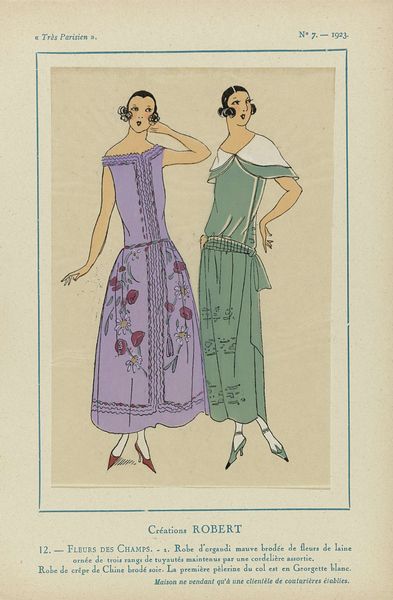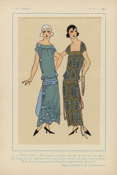 This fashion plate, Très Parisien, 1923, No 7, probably made with watercolour and ink, presents two tango dresses, and an almost blueprint-like approach to colour and form. The artist’s interest lies less in rendering the textures of the dresses, and more in the shapes they create. We might notice, for instance, the orange dress on the right. See how the dark blooms are distributed in a regular pattern, almost like a wallpaper design, and how this clashes with the white stripe down the centre, which is edged with a row of buttons. The whole piece reads almost like a flattened collage, or a drawing that’s been made in separate parts and then assembled. The longer you look, the more the image seems to question what is ‘foreground’ and ‘background’. There is something in this playful approach which puts me in mind of David Hockney, but perhaps he was looking at images like this? What is clear is that art never emerges in a vacuum, but lives in an ongoing exchange of ideas across time.