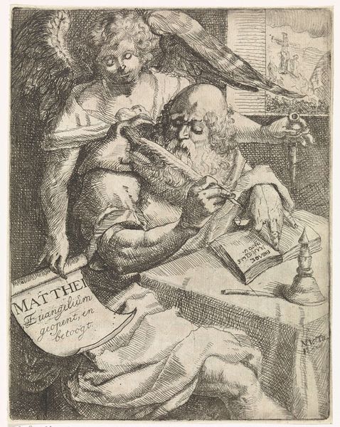 Curator: Here we have Sebald Beham's 1526 engraving, "Moses and Aaron," currently held in the Rijksmuseum collection. Editor: It's…strikingly tactile for a print. You can almost feel the roughness of their garments and the crisp edges of that book. It also strikes me as slightly severe in tone. Curator: Indeed. The severe mood you observe resonates with the story of divine law and authority embodied in these figures. Note how the Tablets of the Law behind Moses mirror his steadfast gaze. The composition directs our eyes to the power they represent. Editor: But it’s all made through labor: the crafting of the metal plate, the repetitive actions to make each impression. I wonder, how did this object circulate, and who could afford such a carefully wrought image? These were commodities, right? Curator: Undoubtedly. This engraving functions both as an object of devotion and a disseminator of religious doctrine, tapping into deeply rooted cultural narratives. Notice how Aaron's priestly headdress symbolizes his role, connecting him to traditions of power and divine service that run throughout history. Editor: Yet look at how Beham renders these robes. Through his process, you sense the artist is dealing with something deeply textural: the wool, the layering…it suggests the social hierarchy and material comfort afforded to these figures. The sharp line work is economical too—reflecting likely mass production. Curator: The material production amplified the circulation of their intertwined destinies, linking them to timeless themes of leadership, obedience, and divine will. Their expressions become etched in the cultural memory of the time. Editor: Exactly. Thinking about it, Beham is embedding these ideological pronouncements *in* the material itself. The circulation is key, and those repeated acts of printing made certain beliefs portable. Curator: Precisely, their story gains new layers with each encounter, shaped by individual perceptions and evolving interpretations. Editor: Looking at it now, knowing more about its context, I appreciate how Beham really manipulated these material properties to convey specific ideological meaning. Curator: It is a piece that certainly continues to offer fresh symbolic resonance for viewers to unpack even now.