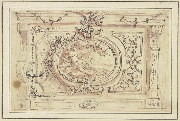 Curator: The Rijksmuseum houses this engraving by Jan Goeree, titled "Wapen met een medaillon," dating from about 1680 to 1731. It presents a baroque coat-of-arms embellished with figuration. What's your initial reaction? Editor: Faded grandeur. All the rococo flourishes, putti straining, that heavy cartouche, but the ink is so delicate it gives everything a spectral quality, like looking at a ghost of wealth and status. What about the materials do you think helped create that aesthetic? Curator: The very nature of engraving, a printmaking technique, contributes. Carving those fine lines into a metal plate, then transferring that to paper... it's inherently about replication, dissemination of imagery. Did this heraldic device become reproduced widely? Who was meant to see it? Editor: Exactly. Engraving allowed this message, whether of power or identity, to circulate beyond the elites who'd usually commission something like this in painted form. Plus, we need to consider the paper. It's aged and worn, adding another layer to our interpretation of time, revealing signs of material deterioration from an otherwise controlled context, a marker of its shifting socio-economic position. Curator: And look within the medallion—a figure reclining in a landscape, the text reading "Genetrice," evoking notions of ancestry, maybe even some classical muse? Perhaps whoever this coat of arms represented was striving to project an image of not just power, but also of cultural refinement. Editor: Maybe. Or, look at the labor needed for this detailed engraving - was Goeree also interested in displaying his skill? In turning a more commonplace request, a family's symbolic history, into something resembling High Art, blurring those traditional genre boundaries? It makes me wonder about the artist’s socio-economic background versus that of their patron. Curator: Food for thought, absolutely. And for me, in those delicate lines and the symbolic weight loaded onto such a fragile thing, there's something undeniably poetic, even wistful. Editor: Yes. Perhaps in that contrast—between ambition and delicate execution, lasting social aspirations represented through increasingly less stable and worn physical properties—there exists something almost brutally human about its reach.