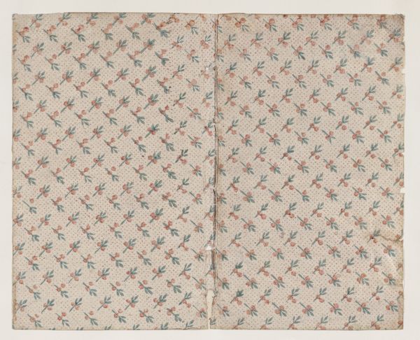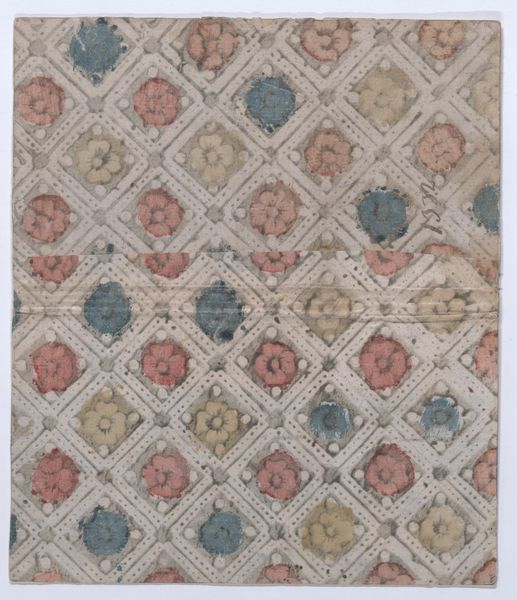 Curator: Looking at this, I immediately think of a faded memory. Something familiar, almost comforting, yet distant. Editor: That's an interesting reading. What you're responding to is most likely the overall pattern, achieved by repeating a few floral and circular motifs. It’s a sheet of mixed-media from between 1800 and 1900, currently held at the Metropolitan Museum of Art, entitled "Sheet with overall pattern of flowers and circles," and made by an anonymous artist. Curator: Precisely! The repeated floral shapes…are they laurel leaves?…set within this gridded format evoke feelings of both triumph and containment. What function do you suppose it served? A study for wallpaper perhaps, or maybe an exercise? Editor: Textile design, quite likely. I notice how the rhomboid is clearly laid out to optimize for imprinting. It could easily be adjusted in production, shifting its material effect significantly by only changing the dye used. It speaks volumes about surface treatment, the use of regular shapes—circle inside circle—set against a matrix of foliage. Curator: It's fascinating how a simple set of symbols can communicate across generations. A flower still speaks to growth and cyclical renewal. Editor: Absolutely. Though here, I’d also add a comment about how geometric forms control the organic flow of design, introducing a structural constraint. I find the contrast compelling. And look at the water stains on the paper; accidental marks also contribute. Curator: Agreed, such defects become intrinsic parts of the design. They narrate the passage of time, use, history… They allow viewers like myself to relate, engage and recall our experiences when interacting with art like this piece, rather than view it from a fixed or purely 'objective' view. Editor: Right, it’s tempting to think what meanings viewers will associate with such patterned media far in the future, even after all the dyes fade completely away. The structural aspects will likely continue communicating to anyone analyzing this piece—regardless of what meanings people ascribe to the overall pattern. Curator: Anonymity allows us a rare opportunity to project on its symbols. Now, I wonder if that's true about symbols in general… Editor: That is an important observation for another occasion. In the meantime, may you be inspired by this piece to consider a simple structural design and an imprinted visual symbol or medium.