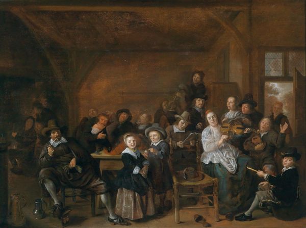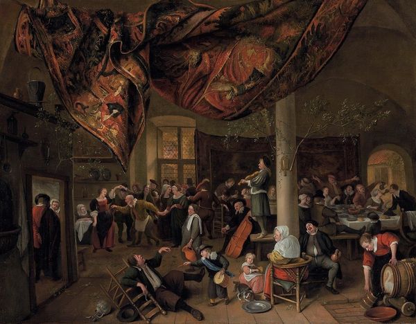 Jan Steen painted ‘Twin Birth Celebration’ in the Dutch Republic using oil on canvas. Steen, a master of genre painting, here shows a chaotic domestic scene rendered with remarkable detail. Note the interplay of light and shadow across the rough surfaces of the kitchenware, furniture, and textiles. Each object speaks to the everyday life of the Dutch Golden Age. Consider the amount of labor embedded in these simple items: the weaving of the baskets, the forging of the metal pots, the shaping of wooden chairs. These were all products of skilled craftspeople and the domestic labor of women, often overlooked in grand historical narratives. Steen's focus on these details elevates the ordinary, and reminds us that even in moments of celebration, the material world and the labor that sustains it are ever-present. It’s through this attention to the everyday that Steen bridges the gap between high art and the realities of working-class life.