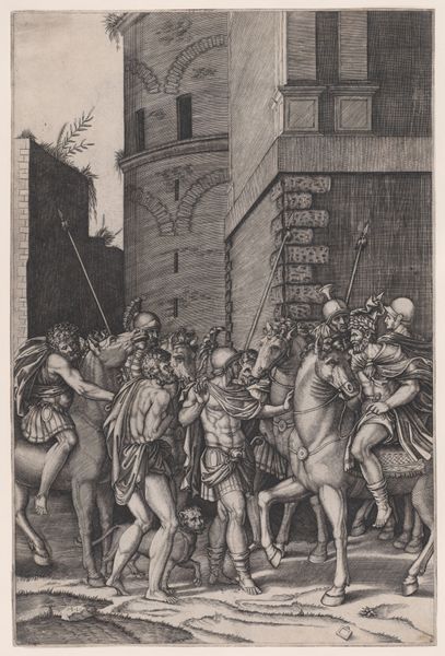 Léon Davent created this print, Wrath, from the 'Seven Deadly Sins' in the mid-16th century. The circular composition is densely packed with figures enacting a scene of violent retribution, all rendered in meticulous detail through engraving. The artist's masterful use of line creates a sense of depth and frenetic energy. The figures are tightly interwoven, their actions converging towards the centre where acts of violence are taking place. Davent uses light and shadow to heighten the dramatic intensity, emphasizing the contorted bodies and anguished expressions of the figures. The architectural backdrop, engulfed in flames, provides a stage for the unfolding drama. The scene challenges conventional notions of justice by highlighting the raw, destructive power of human emotion. The work invites us to reflect on the darker aspects of human nature and the potential consequences of unchecked anger. This is not merely a depiction of violence, but a contemplation on the psychological and societal impacts of wrath.