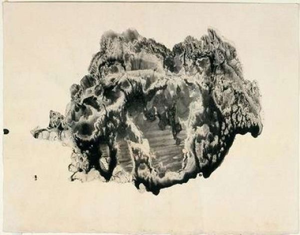 Curator: The overwhelming blue certainly makes an impression! The composition suggests something almost otherworldly. What is your take? Editor: That somber palette resonates deeply, especially given that this oil painting, “Libidoscaphe Epongeur,” was conceived by Felix Labisse in 1962, amidst sociopolitical tensions and evolving artistic landscapes of post-war Europe. It certainly taps into an existential vein. Curator: Absolutely. Consider the term “Libidoscaphe”; that concept of a vessel or vehicle for libidinal energy, fused with ‘épongeur,’ the sponge—it evokes porous boundaries between self and other, individual and collective consciousness, doesn't it? Labisse, as a figure closely associated with Surrealism, consistently destabilized fixed meanings. Editor: Indeed. Looking at the formal qualities, the textural contrasts create compelling tension. The smooth surface of the "water" meeting that convoluted, porous mass above creates an unsettling contrast, like a sponge that’s almost petrified. What could it signify beyond that tension? Curator: Well, knowing that Labisse positioned himself within a milieu that challenged conventional sexual and social norms—a lot can be deciphered from that perspective. The phallic form and watery milieu cannot be ignored from the stand-point of gender fluidity studies. This would echo ideas present at the time challenging conservative sexualities. Editor: I’m interested in those "holes" or the “pores" on this floating mass which disrupt its overall volume—they create rhythmic patterns that play with the surface quality, denying absolute definition. Curator: It underscores a concept that nothing remains isolated. Labisse challenges our tendency toward definition and fixed understanding. It could be viewed from intersectional themes within queer studies regarding the porousness between identity, gender expression and desire. Editor: Considering your interpretation, the abstraction blends into something more, opening discussions within and across academic fields. This work allows for myriad insights, each layered with nuance. Curator: Agreed! Hopefully, our insights provide a fresh consideration of “Libidoscaphe Epongeur”, where abstract form engages sociopolitical history. Editor: This was illuminating. Hopefully we encourage others to find unique forms, compositions and artistic interpretations within Labisse’s visual language!