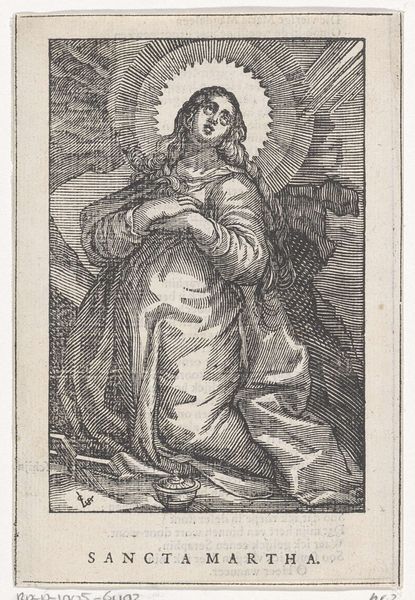 This is Cornelis Bloemaert’s "Madonna zittend op de maansikkel" from the 17th century, rendered with fine lines in an engraving. The composition immediately draws your eye to the Madonna and Child, framed by a radiant halo and seated upon a crescent moon. Notice how Bloemaert uses line and form to create a sense of ethereal weight. The Madonna's robes are voluminous, yet the delicate lines keep the figure from feeling heavy. The radiating lines of the halo, contrasted with the solid form of the moon, create a visual tension, destabilizing our sense of space. The Madonna as ‘seated on the moon’ elevates her, challenging earthly constraints. Consider the semiotic implications of the crescent moon beneath her feet, traditionally a symbol of the Virgin Mary’s purity and dominion. Yet, here, it also serves as a structural base, literally supporting the central figure. This detail invites us to reflect on how religious symbols can simultaneously reinforce and transcend established meanings.