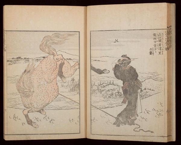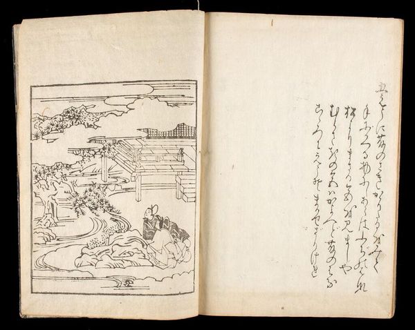 Curator: This delicate book, approximately 27 by 19 centimeters, is attributed to Hishikawa Moronobu. It's titled *Illustrated Birds and Flowers, with Text*, or *KachÅ e-zukushi*. Editor: The stark black lines on aged paper create an immediate feeling of contemplative stillness. The repetition in the bird's feathers, that cascade of pattern, is quite mesmerizing. Curator: Indeed. Birds and flowers, *kachÅ*, are potent symbols in Japanese art, representing the seasons and evoking themes of beauty, fragility, and the transience of life. Editor: I'm drawn to the contrast between the dense pattern of the plumage and the bare branches. It’s an interesting tension—presence and absence coexisting on the page. Curator: The text likely adds another layer, perhaps poetry connecting to the visual metaphors, offering a holistic experience reflecting cultural values. Editor: Yes, the balance and visual harmony, combined with that unknown script, invite a deeper look at the relationship between image and text. Curator: It's a testament to how seemingly simple drawings can carry profound cultural weight.