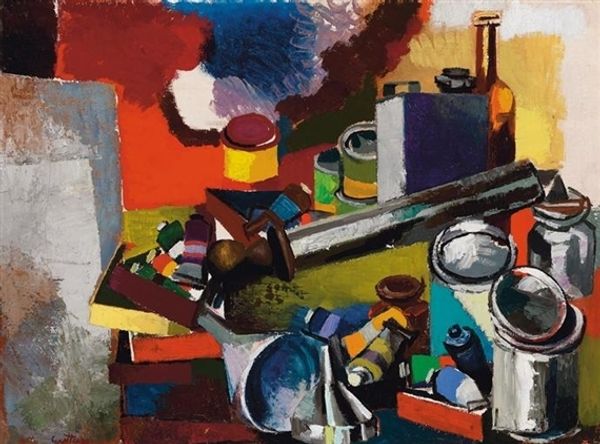 Avigdor Arikha made this untitled painting using oil, giving us a window into his process. The painting is full of tentative shapes, like he was thinking out loud with his brush. Look at the cluster of objects at the bottom. There’s a real tension between the browns and blues, the solid geometry and uncertain edges. I love that little red square right in the middle, holding the whole thing together. The paint is applied with a certain searching quality, which makes you think about the artist trying to capture a fleeting sensation. Arikha’s work often focused on direct observation and his commitment to realism. But there's also a strong abstract quality, which reminds me a little of the work of Giorgio Morandi, who also spent his career refining the act of looking. This piece invites us to find poetry in the everyday, and to revel in the uncertainties of perception.