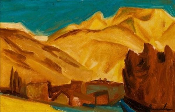 Editor: This is Nicholas Roerich's "Maitreya. Tibet," painted in 1937, using oil paints. It feels very… remote. Like a forgotten monument in a vast landscape. What do you see in this piece, in terms of its significance beyond just a landscape? Curator: Beyond its surface beauty, I see a potent engagement with Orientalist and Expressionist visual languages to frame complex postcolonial cultural dynamics and religious iconographies. The figure of Maitreya, the future Buddha, situated in the desolate Tibetan landscape invites us to think about historical orientalism and its relation to cultural identity, power, and representation. Where do you see the hints of ‘orientalism’ at play? Editor: Well, the title itself places it in Tibet, but beyond that, the architectural structure seems almost alien, suggesting a different cultural context, while the Expressionistic brushstrokes create an almost spiritual quality that separates this from being just any mountainscape painting.. Curator: Precisely. And this blending, this aesthetic negotiation between Roerich's artistic background and the spiritual and geographical ‘other’, how does it make you feel, knowing this was painted during the rise of oppressive totalitarian regimes? Editor: That adds another layer of complexity! Suddenly, the isolation feels more charged. Is Roerich suggesting a kind of spiritual refuge in the face of political turmoil? A commentary on resistance against the current powers using ancient knowledge and wisdom as a defense? Curator: Absolutely! This tension, that interplay between personal faith, political context, and artistic expression, I feel is vital to interpreting the painting's meaning, and the hope for spiritual resistance it could carry. Editor: It’s fascinating how one painting can hold so many layers of meaning, about its creation time and also how it relates to our present! Thank you so much for shining a light on that, making me see all these things I didn’t notice at first.