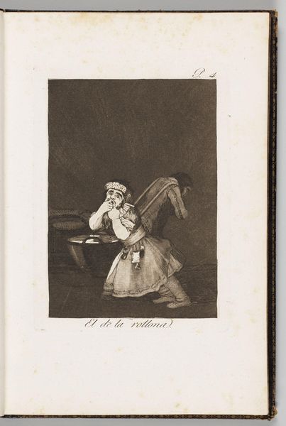 Curator: Here we have Francisco Goya's etching, "To the Count Palatine." Editor: Oh, this feels a little…unsettling. There’s something about the expressions and the lighting that gives me the shivers. Curator: Goya was known for his social commentary, and the Count Palatine was a title often associated with privilege. The stooped posture of the men suggests humility, or perhaps defeat. Editor: And the central figure looks almost puppet-like. Are we seeing a critique of power, the way it manipulates and perhaps even degrades? Curator: Precisely. Goya often used symbolic imagery to convey complex ideas about society, psychology, and the human condition. Editor: I’ll definitely be pondering this one for a while. It's more than just a picture, it's a question mark.