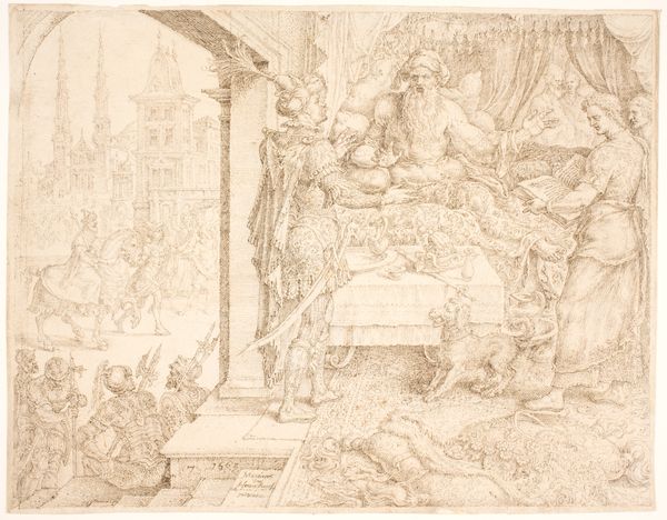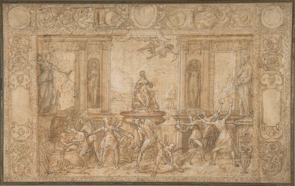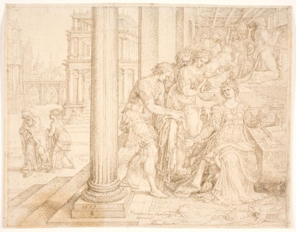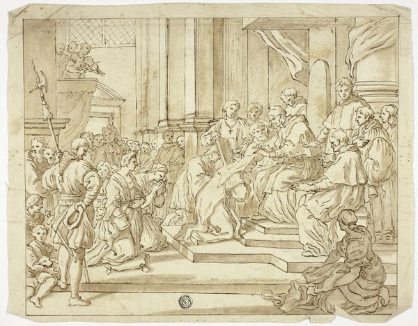 Editor: So, this is "Design for a Stage Set: Solomon Receiving the Queen of Sheba" by Carlo Galli Bibiena, likely created between 1728 and 1778. It’s ink, etching and drawing on paper. It feels incredibly theatrical, almost overwhelming. What kind of impact do you think this design would have had? Curator: It’s important to consider how stage design, particularly in the Baroque period, served a public function. It wasn't just entertainment, it was spectacle! Bibiena's designs often portrayed rulers in a grandiose, almost allegorical way. These kinds of scenes were integral to how power projected itself. Consider where performances like this took place and for whom? Editor: Ah, like a propaganda piece, almost? It’s definitely opulent, but knowing that the elites probably enjoyed these displays and controlled the narrative makes it less appealing to me, I must admit. Curator: Precisely! This image underscores the relationship between art, power, and public perception. Did the Queen of Sheba even truly visit King Solomon, and does that matter here? Think about the role that the museum plays in contextualizing art, and shaping an audience’s perception and political understanding. What biases might a curator need to address? Editor: I see what you mean. It's a drawing for a play but beyond entertainment, it communicates how leaders wished to be seen, both then and now. Thank you; I am taking away more questions than answers today. Curator: Excellent! Engaging with art history should provoke that deeper critical questioning and I would just like to say that stage designs help us consider how visual imagery was, and is, still used to reinforce hierarchies and project power in society.
