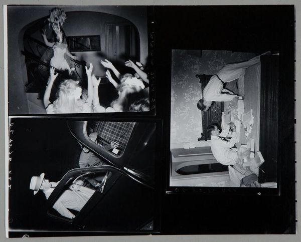 Bas Jan Ader made this photograph, titled "Tea Party", using a cardboard box, a branch, and what appears to be a full tea service. The box, likely sourced from everyday life and mass production, is upended and precariously held aloft by a simple stick. This crude structure contrasts sharply with the refined scene it shelters: Ader himself, dressed in a suit, enjoying tea. The juxtaposition of the mundane cardboard and the genteel tea party creates a deliberate tension, highlighting the absurdity of the situation. This image also encourages us to think about how work and class appear in it: here is this artist, in the setting of a forest, creating a parody or a humorous critique, through a photograph. By drawing attention to these materials and the act of making, Ader challenges traditional distinctions between fine art and everyday experience.
