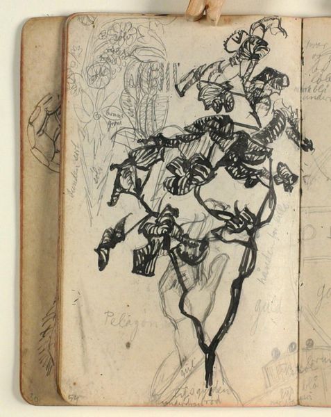 Editor: This is Niels Larsen Stevns' "Kompositionsudkast til Knytlingesagaens fortælling om Knud den helliges udsendinge i Vendsyssel, Astråd og Svend, notat," from between 1932 and 1935, rendered in ink on paper. It’s quite a dynamic sketch; almost chaotic. What do you make of this work? Curator: As a sketch, the focus shifts to the artist's process itself. The labor involved in visualizing the narrative is evident in each stroke. It isn't about illusionism here, but about Stevns working through his understanding of the saga’s material realities: travel, conflict, the sheer physicality of these events. Do you see how the rapid, repetitive lines suggest a kind of churning, restless energy? Editor: Yes, the lines really do convey movement! It almost looks like a storm or some kind of violent struggle is taking place. Curator: Exactly. And think about the availability and cost of ink and paper during that time, influencing the immediacy and rawness of the piece. Stevns wasn’t trying to create a finished product; he was using readily available materials to grapple with a story about power, faith, and potentially, resistance. How might the act of sketching itself be a form of engagement with these themes? Editor: I guess that the materials allowed for more spontaneous reactions compared to painting. Also, sketches might be more accessible to ordinary people? Curator: Precisely! A sketch like this brings the grand narrative down to a more human scale, emphasizing the labor of artistic creation alongside the events depicted. The means of production inform the message itself. Editor: I never thought about a sketch having such a connection to real-world production. I suppose it is the rawness, both narratively and visually, that stands out the most now. Thank you. Curator: Indeed! Recognizing how materials and methods intertwine with the social context is key to appreciating the piece.
