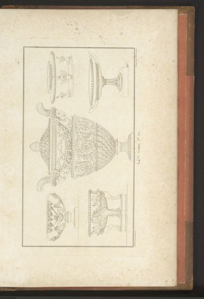 Curator: We’re looking at "Vazen en schaal," an 1820 drawing rendered in ink on paper by Pierre-Nicolas Beauvallet. The drawing is essentially a design sheet featuring three ornate vase designs. What strikes you initially? Editor: A sense of elegant restraint. The lines are so precise, so delicate. Each vase is a study in controlled curvature and detailed ornamentation. It evokes a kind of austere beauty, doesn’t it? Curator: Indeed. And that restraint speaks volumes, placing the work squarely within the Neoclassical movement, echoing the revived interest in classical antiquity and its ideals of order, reason, and balance. These vases aren’t merely decorative objects; they’re signifiers of status, taste, and a specific worldview rooted in Enlightenment principles and gender roles. Editor: You're right, each vase adheres to a distinct structural logic. I'm drawn to how Beauvallet uses line to create depth and volume, employing hatching and cross-hatching to imply shadow. It's almost like he's dissecting the platonic ideal of a vase. Curator: But I'd also highlight the depictions adorning each one. What are we to make of the mythological and classical scenes being evoked? In this era of revolution, how might images like these, appearing on domestic objects, become touchstones in establishing both national identity and domesticity, where men enact historical narratives, and where women assume decorative postures as muses? Editor: Perhaps it is, as you say, an ideological maneuver disguised as design. But look at the sheer artistry of the rendering itself—how line transforms from outline to the suggestion of form and texture. The variations across the three designs provide visual complexity within that formal restraint that fascinates me. Curator: Certainly, but the variations also betray shifting interpretations of the classical past. By focusing on form and function, one also has to acknowledge how design itself serves and extends certain assumptions in its own cultural moment. Editor: A vital reminder to never isolate form from its context, and vice-versa. Thank you. Curator: An important reminder to consider how the past reverberates, as we all continue to create—a perspective brought alive through drawing like this.