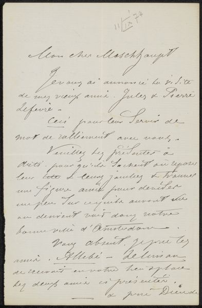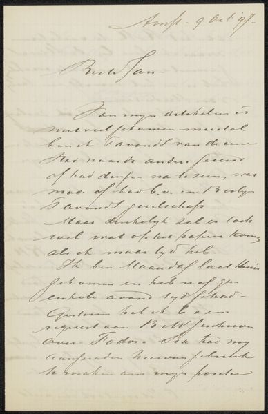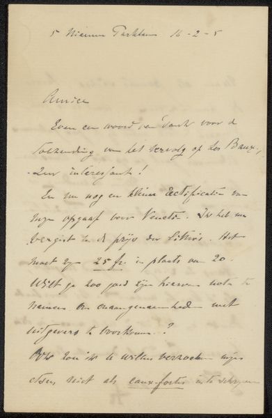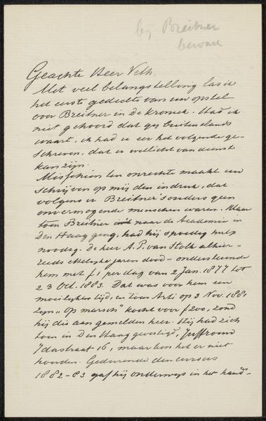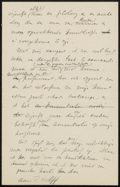 Curator: This document, "Brief aan Philip Zilcken" by Anton L. Koster, likely dating from around 1903 to 1912, is an ink drawing on paper, showcasing a beautiful example of calligraphy. Editor: It’s certainly an intriguing piece! I’m struck by the elegant, flowing script. It almost feels like I'm peering into the past, connecting with someone through their handwriting. What visual or cultural significance do you find embedded in this calligraphic style? Curator: The visual weight of calligraphy cannot be overstated. In Koster’s time, handwriting was deeply personal and reflected one's education and status. Do you notice how the deliberate strokes and flourishes, in themselves, signal a respect for tradition and the art of communication? Editor: Yes, it's evident. The way the letters connect and loop seems almost performative. Almost as if Koster were intentionally drawing attention to his careful penmanship! Curator: Precisely! Consider also the historical context. This letter is essentially a symbol of connection. Before mass communication, letters were vital for maintaining relationships, sharing knowledge, and conducting business. What message might Koster convey through a meticulously crafted message, as compared to, say, a simple telegram? Editor: I suppose it demonstrates commitment to the recipient, offering a more nuanced emotional investment. It's interesting to think how such intentional artistry infuses the very act of communicating. I will see calligraphy in a new light now. Thanks. Curator: My pleasure. This type of investigation truly opens doors to understanding how we attribute meaning and intent in various cultural representations.