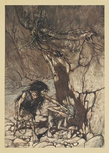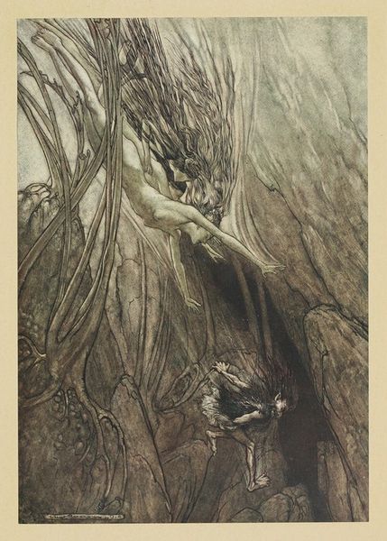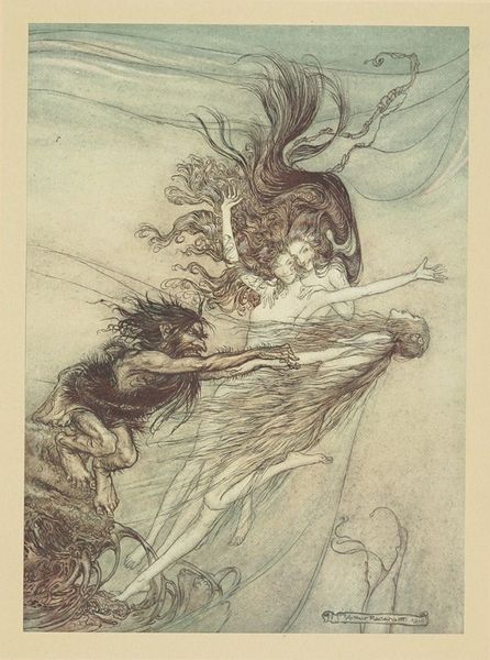 Editor: We're looking at an ink and watercolor drawing by Arthur Rackham, titled “’The knight took the beautiful girl in his arms and bore her over the narrow space where the stream had divided her little island from the shore.’" The overall impression is one of deep romance and mystery, intensified by the dark, almost claustrophobic, landscape. What stands out to you, in terms of its formal qualities? Curator: Note the use of line in this piece. See how Rackham employs fine, intricate linework to create texture and depth, particularly in the rendering of the trees and flowing water. Observe the contrast between the dark, tangled forest and the comparatively smooth, pale skin of the figures. How does this contrast guide your eye? Editor: It really highlights the figures, almost like a spotlight. What do you make of the muted color palette? Curator: Precisely. The subdued colors – mostly blues, browns, and greens – contribute to the dreamlike atmosphere, and the lack of strong color creates an emphasis on form and composition. Focus on how Rackham balances areas of dense detail with areas of relative emptiness. For example, consider the swirling lines of the water juxtaposed against the calmer expanse of the sky. Do you see any interplay of dark and light tones that helps to enhance this dynamic effect? Editor: Yes, the darker, dense areas really make the lighter portions pop. It's masterful in creating that romantic, storybook mood. Curator: Indeed. It's in Rackham's compositional choices and manipulation of these basic artistic elements that the essence of the work resides. We find its romanticism not in explicit symbols, but in the visual push and pull he orchestrates. Editor: This was a fascinating lesson in seeing beyond the surface! Curator: Indeed. By focusing on Rackham’s careful articulation of lines, colours and shapes, the narrative unfolds from the interplay of visual forms themselves.