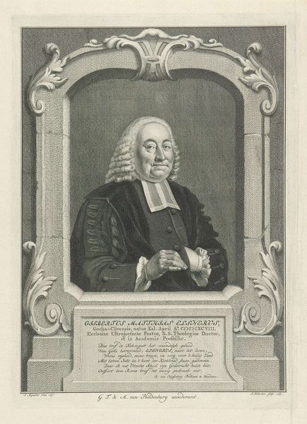 Editor: This is "Portret van Laurentius Steversloot" by Reynier Blokhuysen, dating from around 1673 to 1744. It's an engraving. It strikes me as very formal, befitting its subject, but I am wondering what exactly can be said about it? Curator: Well, let’s start with the material. The fact that it’s an engraving immediately tells us about production. Prints like this were reproducible; think about the means by which information and status circulated. Who would commission a print like this and what was the relationship of the sitter to the engraver? Was this an open market print or commissioned by the family? Editor: That's interesting. So, the choice of engraving implies a specific intent for wider dissemination and potential consumption beyond just a wealthy patron? Curator: Exactly. Engravings allowed for a more democratic circulation of images. Consider the labour involved. The engraver carefully cuts into a metal plate; the time and skill reflect a specific kind of artistic production, not simply high art. It shows how artisanal craft becomes intertwined with representation of elite status. Notice also how text and image work together here; can we assume everyone who views this knows how to read? Who is this made for? Editor: That's something I hadn't considered. The integration of text certainly emphasizes the intended audience and reinforces Steversloot's accomplishments and lineage. Also, the frame within a frame creates an objectified form which enhances the importance of the individual, but still remains separate from the world. Curator: Precisely. So it's not just a portrait, it is a crafted, socially embedded artifact. I see value in understanding the processes through which status is displayed. Editor: It gives new dimensions to an art from, transforming it beyond a representation of the past, and integrating into cultural materiality. Curator: Indeed, thinking about it that way offers us so much more than just biography.