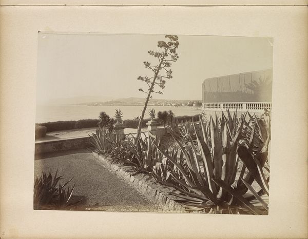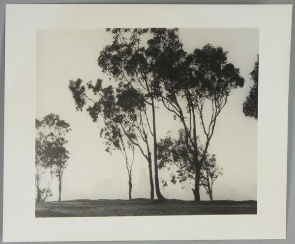 Editor: This photograph, "Untitled (Santa Monica)" by Bill Dane, captures a California beach scene. The black and white palette gives it a timeless quality. What cultural narratives do you see at play here? Curator: Well, the stark contrast and almost skeletal trees against the ocean invoke a feeling of resilience. Do you notice how the repetition of the trees might echo the recurring cycles of nature and human experience? Editor: I do. It's interesting to consider the enduring symbolism of trees as life and growth against the backdrop of the ever-changing sea. Curator: Exactly. Dane seems to use these contrasting elements to suggest a dialogue between permanence and transience, inviting us to reflect on our own place within this continuum. Editor: That's a perspective I hadn't fully considered. Thanks for pointing out the way these elements play together. Curator: My pleasure! It's always rewarding to uncover the layers of meaning embedded within an image.