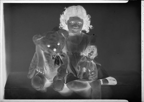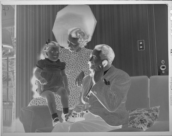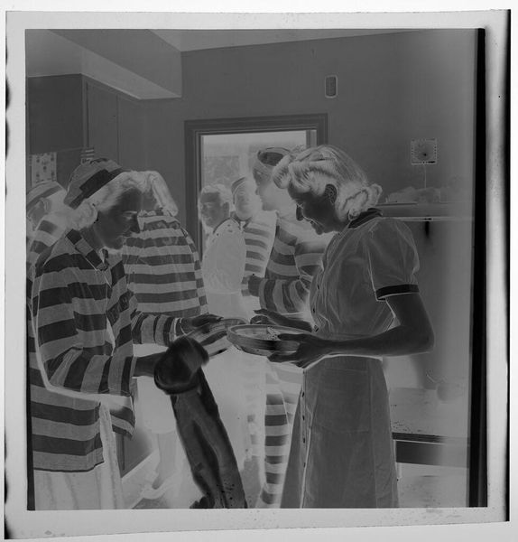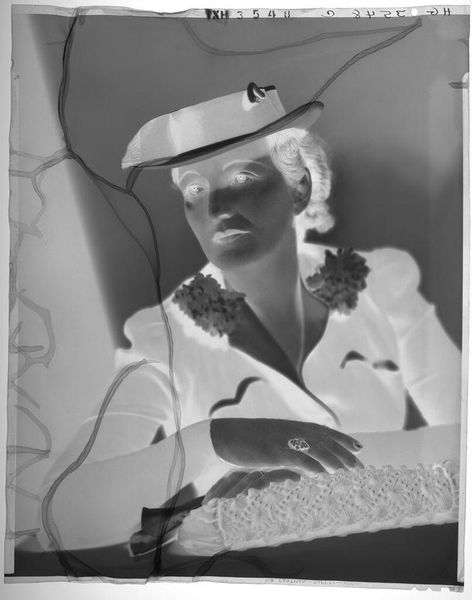 Editor: This photograph, titled "Untitled (two elderly women wearing hats standing and drinking tea)" by Jack Gould, features a seemingly reversed grayscale palette. It gives the photo an eerie feeling. What do you make of the composition? Curator: Observe how the luminosity is manipulated to create an inverted visual hierarchy. The photographic reversal emphasizes texture, line, and form over realistic representation. The tension between positive and negative space is heightened. Editor: So, it's less about what's depicted and more about *how* it's depicted? Curator: Precisely. Consider the interplay of light and dark – how does this manipulation alter your perception of the subjects and their interaction? Editor: I hadn't considered the interaction of positive and negative space before. I'll definitely look closer next time! Curator: A close reading reveals so much.