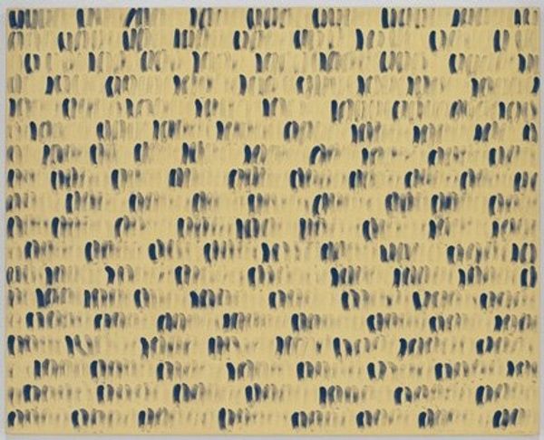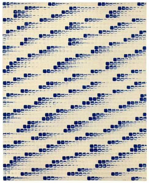 Editor: Right, let's talk about Lee Ufan’s "From Line," a 1970 ink on paper drawing. It’s dominated by these repetitive, almost pixelated blue marks…they give off a somewhat digital or code-like feeling despite being created with ink. How do you interpret this work? Curator: I see patterns, Editor. Remnants of language, perhaps even ancestral memory trying to surface. Consider the time it was created. Japan was in a period of immense social and economic transformation. What kind of mark does tradition leave on modernity? Editor: Tradition’s mark? Curator: Exactly! Look closely, they aren't perfect repetitions are they? They are imperfect symbols struggling to retain their original meaning as they evolve with new interpretations across generations, creating this tension between precision and organic change. Where does that friction lead us, do you think? Editor: I guess that it shows that even the strictest structure is constantly being warped, losing information but gaining new resonance. Curator: Precisely. Symbols carry weight. Ufan prompts us to contemplate continuity through these carefully made strokes. How does it all resonate for you now? Editor: I never thought about it that way... looking at the little strokes as carrying meaning like an alphabet, the same, but also subtly distinct. It’s more powerful now. Curator: It’s the paradox of cultural memory. Always there, always shifting. I am glad this piece helped expand your vision!