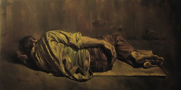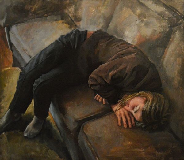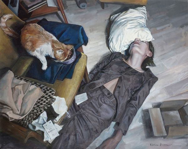Curator: Here we have Valeria Duca's painting "Sleep", an oil on canvas portrait rendering a figure at rest. The intimate scene evokes a sense of quiet contemplation. Editor: Immediately, I notice the subdued palette. A cocoon of grey blankets seems to engulf the figure. There's a vulnerability to it; almost melancholic. Curator: Note the artist’s precise application of brushstrokes. Duca constructs form with a strategic emphasis on geometric composition that focuses attention upon texture. The heavy bedding is offset against the stark lines of the bed frame. Editor: I am curious about the choice of sleep as a subject, specifically from a woman's perspective. Sleep, particularly for women, has been a long used as time for labor of thought, reflection, and even escape within social constraints, where women and rest, even now, remain something often ungranted and dismissed as lazy. Curator: Your interpretation highlights important dimensions. Considering art history, sleep is laden with cultural significance; often serving as an allegory, the threshold space where consciousness blurs with oblivion. Yet I cannot help to focus upon its formal arrangement of light and form which makes this work uniquely intimate. Editor: Yes, the artistic merit is undeniable, though in addition, I see a loaded narrative, this space as almost sacred in contrast to an exhausting world outside the frame. This resonates strongly, especially when so many marginalized groups lack the luxury of adequate rest. The quiet then speaks volumes about what is lost. Curator: I can appreciate your point, by thinking about this from an economical point, sleep then embodies a quiet power; one often undermined. Though, on close inspection, the planes that intersect, especially the interplay between shadow and form is what brings that deeper sense of contemplation in how Duca positions it. Editor: I see it less about power dynamics as such and more about its use as one, where these spaces need a great amount of cultural and structural labor to secure and protect; especially for certain persons. I value that Duca captured such quiet. Curator: The dialogue, however, makes Duca's portrait resonate with renewed sensitivity. It shows the potency that stillness can evoke when reflecting on what and whom it concerns. Editor: I concur, such intersection between composition and sociopolitical considerations elevates our interpretation. Hopefully, this helps our visitors see past a peaceful bedroom scene.
